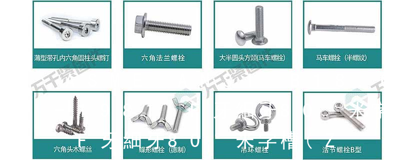3.螺釘:也是由頭部和螺桿兩部分構成的一類緊固件,按用途可以分為三類:機器螺釘、緊定螺釘和特殊用途螺釘。機器螺釘主要用于一個緊定螺紋孔的零件,與一個帶有通孔的零件之間的緊固連接,不需要螺母配合(這種連接形式稱為螺釘連接,也屬于 (鐵板牙自攻螺絲) B-2: Plastic Tapping Screw. (塑膠用,自攻螺絲) C: Wooden Screw : 木工螺絲 D: Drywall Screw :水泥墻螺絲 E: Self Drilling Screws鉆尾螺絲(不銹鋼鉆尾螺絲,復合材料鉆尾螺絲) F:膨脹螺絲,四片膨脹螺絲又