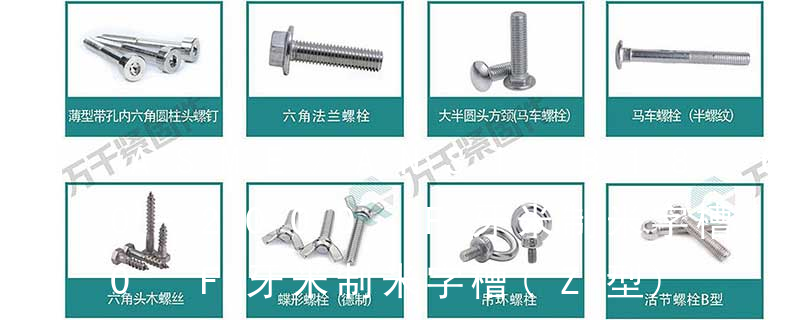 B-1: Sheet Metal Tapping Screw. (鐵板牙自攻螺絲)B-2: Plastic Tapping Screw. ( 塑料用, 自攻螺絲)C: Wooden Screw : 木工螺絲 D: Drywall Screw : 水泥墻螺絲 三. 常見螺絲材質:a.Low Carbon Steel :低碳鋼 ④頭型 :用字母來表示頭型的種類,可參看前文常用螺釘頭型分類。 ⑤牙型/尾型 : 用字母來表示牙型/尾型的種類,可參看前文“常用螺釘牙型/尾型分類”。 ⑥槽型 :參看前文“我司常用螺釘槽型分類”,十字槽或無槽(如沖六角頭螺